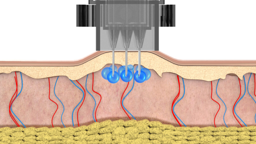 1本ごとの針先の周りに吸引圧をかけて針が皮膚に挿入されてから薬剤が注入されるため、薬剤の注入ロスが少ないことが特徴です。また、注入量と深さの調整が可能なため、薬剤を均一に注入することが可能であり、しっかり効果を得ることができます。